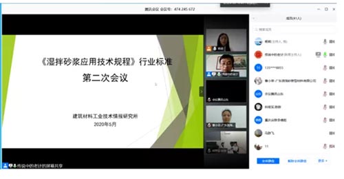 中國(guó)散協(xié)團(tuán)體標(biāo)準(zhǔn)《濕拌砂漿應(yīng)用技術(shù)規(guī)程》第二次標(biāo)準(zhǔn)編制工作會(huì)議于2020年5月22日上午9:30-11:30以網(wǎng)絡(luò)會(huì)議的形式召開。中國(guó)散裝水泥推廣發(fā)展協(xié)會(huì)秘書長(zhǎng)、建筑材料工業(yè)技術(shù)情報(bào)研究所混凝土發(fā)展中心主任孫繼成博士、中國(guó)散裝水泥推廣發(fā)展協(xié)會(huì)專家委員計(jì)海霞高工、建筑材料工業(yè)技術(shù)情報(bào)研究所標(biāo)準(zhǔn)編制工作組楊莉、中建西部建設(shè)北方有限公司技術(shù)中心經(jīng)理張凱峰、成都精準(zhǔn)混凝土有限公司經(jīng)理馬占民、山東弗爾曼新材料集團(tuán)有限公司經(jīng)理肖維錄、主任薛俊書、廣東浪淘砂新型材料有限公司研發(fā)中心主任曹小榮、黃山精強(qiáng)建材股份有限公司副總經(jīng)理程楷、四川同舟化工有限公司技術(shù)片區(qū)負(fù)責(zé)人鄧奎、中信國(guó)安建工集團(tuán)有限公司總工張學(xué)華、麗水市處州混凝土有限公司總經(jīng)理?xiàng)罾凇?shí)驗(yàn)室主任金滿昌;株洲市中建新材料有限公司總經(jīng)理陳新、青島國(guó)基商砼有限公司郇建、昆明匯森混凝土有限公司杜顯茂等41名代表參加了會(huì)議。會(huì)議由建筑材料工業(yè)技術(shù)情報(bào)研究所楊莉主持。首先主編單位中國(guó)散裝水泥推廣發(fā)展協(xié)會(huì)秘書長(zhǎng)、建筑材料工業(yè)技術(shù)情報(bào)研究所孫繼成博士介紹了標(biāo)準(zhǔn)編制要求以及編制工作進(jìn)度計(jì)劃。隨后,中國(guó)散裝水泥推廣發(fā)展協(xié)會(huì)專家委員、主編單位標(biāo)準(zhǔn)編制負(fù)責(zé)人計(jì)海霞高工就濕拌砂漿行業(yè)現(xiàn)狀、標(biāo)準(zhǔn)中創(chuàng)新點(diǎn)和關(guān)鍵點(diǎn)進(jìn)行介紹。標(biāo)準(zhǔn)編制組建筑材料工業(yè)技術(shù)情報(bào)研究所楊莉詳細(xì)介紹了標(biāo)準(zhǔn)文本及條款編制說明,并組織參會(huì)代就凝結(jié)時(shí)間、保塑時(shí)間、14拉伸粘結(jié)強(qiáng)度等關(guān)鍵技術(shù)參數(shù)進(jìn)行交流討論,廣泛征集參編單位意見。該會(huì)議的召開對(duì)標(biāo)準(zhǔn)編制工作起到了大的推進(jìn)作用。標(biāo)準(zhǔn)編制負(fù)責(zé)人計(jì)海霞高工標(biāo)準(zhǔn)編制組工程師楊莉